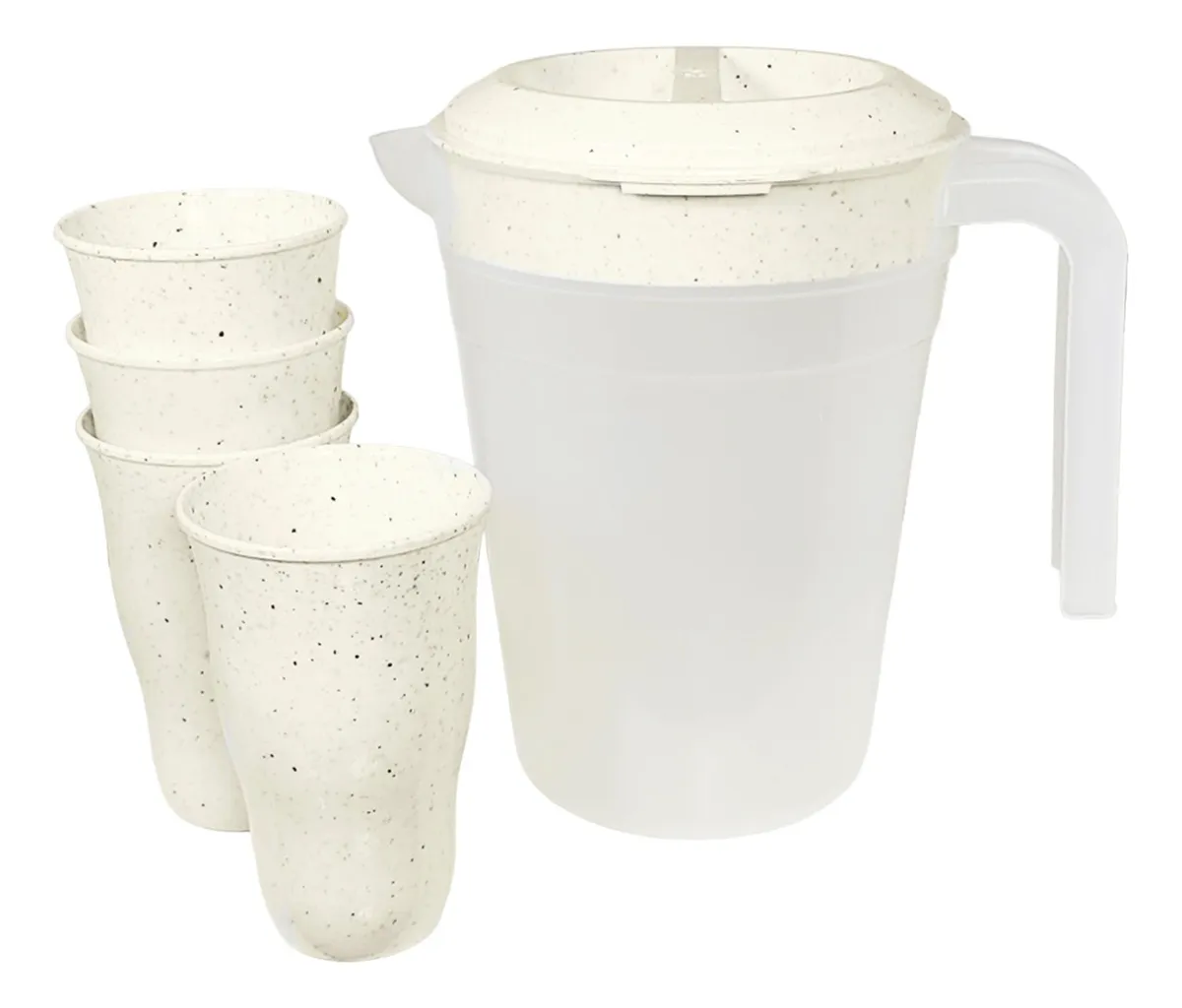 JARRA REDONDA CON TAPA 2,5 LTS + 4 VASOS ONDEADOS ENLOZADO